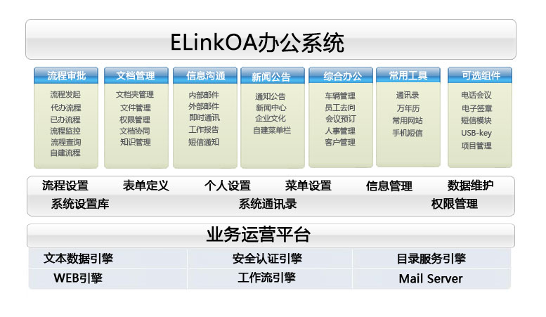 ElinkOA办公系统2015版采用“协同平台”的设计理念,基于J2EE框架,应用SOA/MVC的设计模式,运用了大量先进的诸如Ajax、RSS等web2.0的技术,增强了系统的柔性和开放性,并在智慧运算、高并发、高性能方面实现了重大的技术突破,从而实现了灵活扩展、随需定制、易于整合的技术平台。系统数据集中存取,用户多级权限管理,即完美的保证了系统数据安全,又大大提高系统性能稳定性,还使系统可平滑的过度升级。