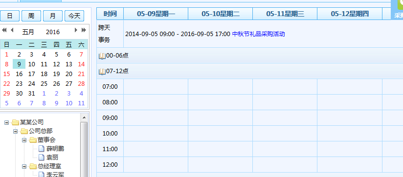 最为常见的时间管理工具:个人备忘录、个人日程、会议室排程表、车辆排程表,这些工具在一个组织进行有效共享,并及时提醒相关人员资源的冲突信息。所 以,OA系统里有可以共享的日程管理、可以共享的员工动态看板、可以共享的会议室占用情况表、可以共享的车辆占用情况表等等。因为OA理解的日程管理实质 上是人的时间管理,所以把所有资源的时间管理统一到一起成为"资源时间管理",这样在统一的时间表上可以展现:所有与这些资源相关的有时间安排(有开始和 结束时间)的事件任务信息都呈现出来。